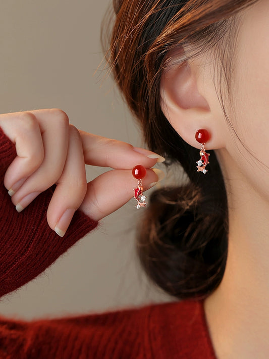 [Xiangnan] 925 Sterling Silver Red Agate Koi Stud Earrings Birth Year 2025 Snake Earrings New Year Female Earrings