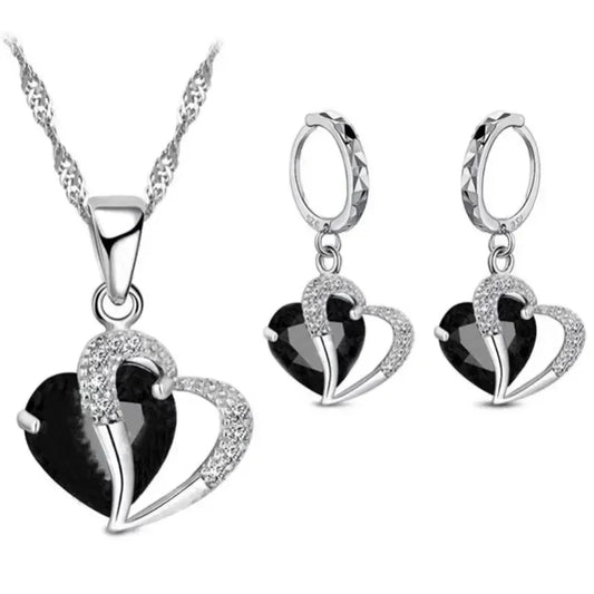 Set of 2 Metal Heart Blue Glass Stone Necklace Earrings Set Hallow Out Heart Charm Clear CZ Pink Red Black Gemstone Jewelry Set